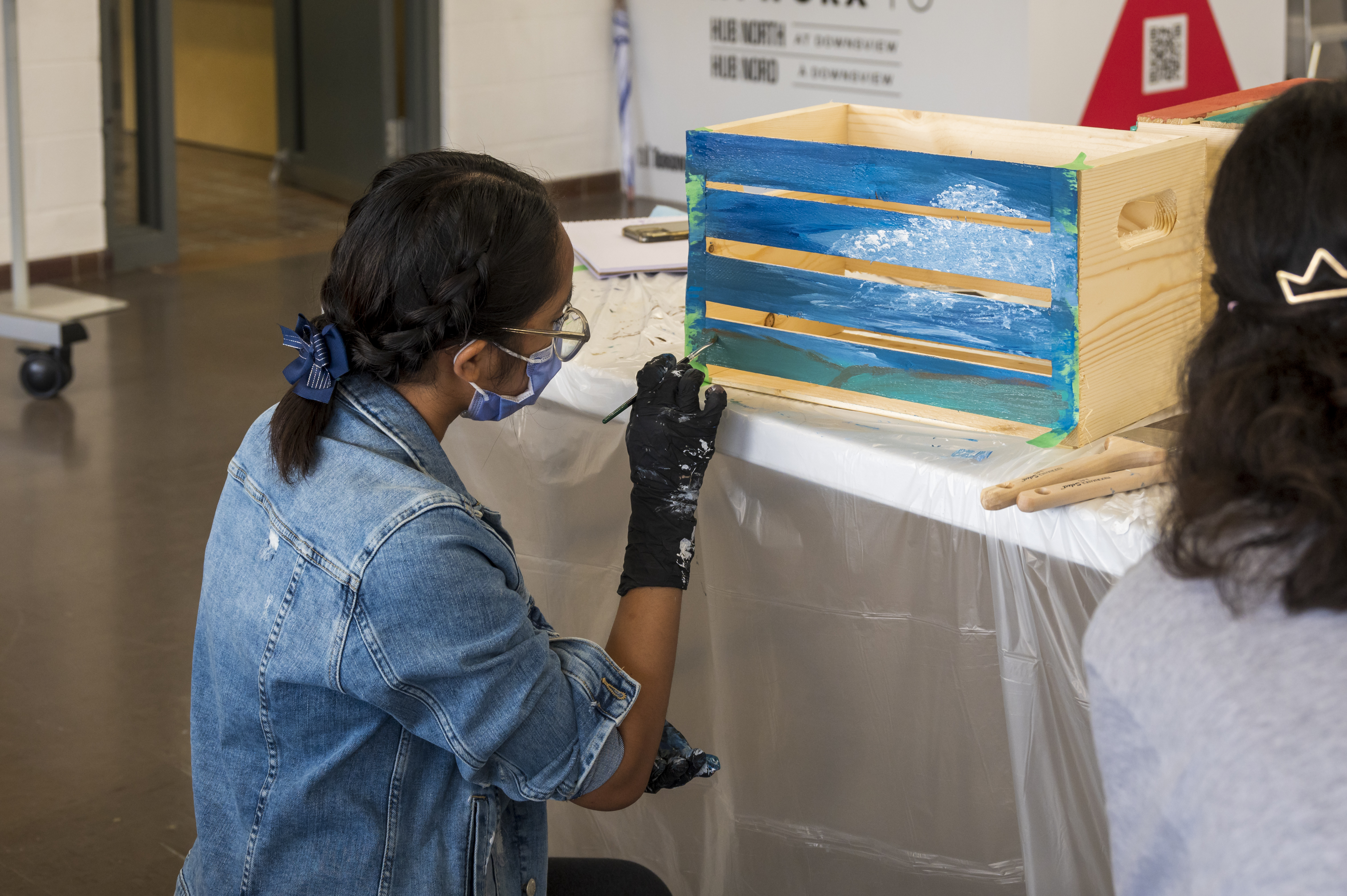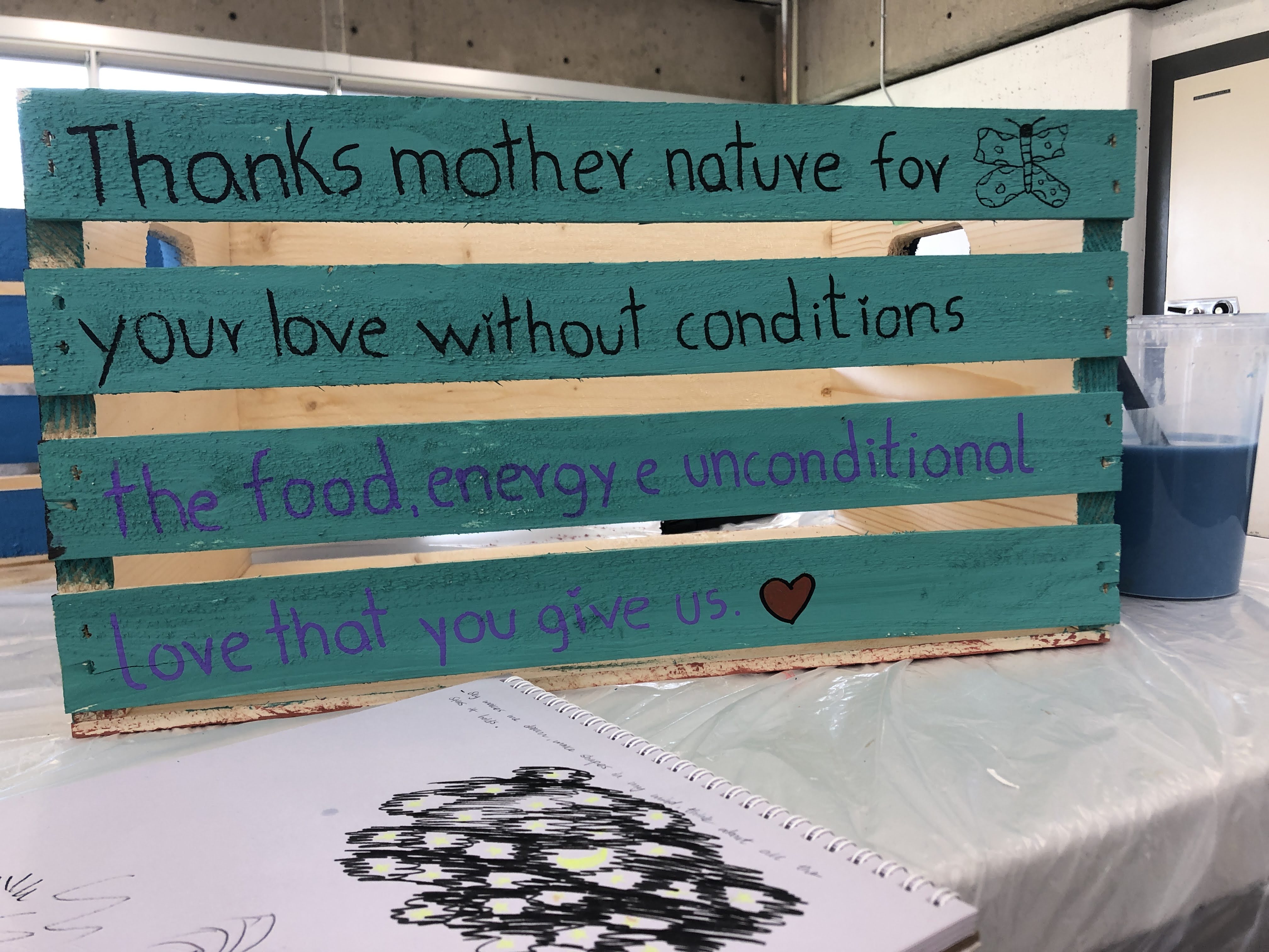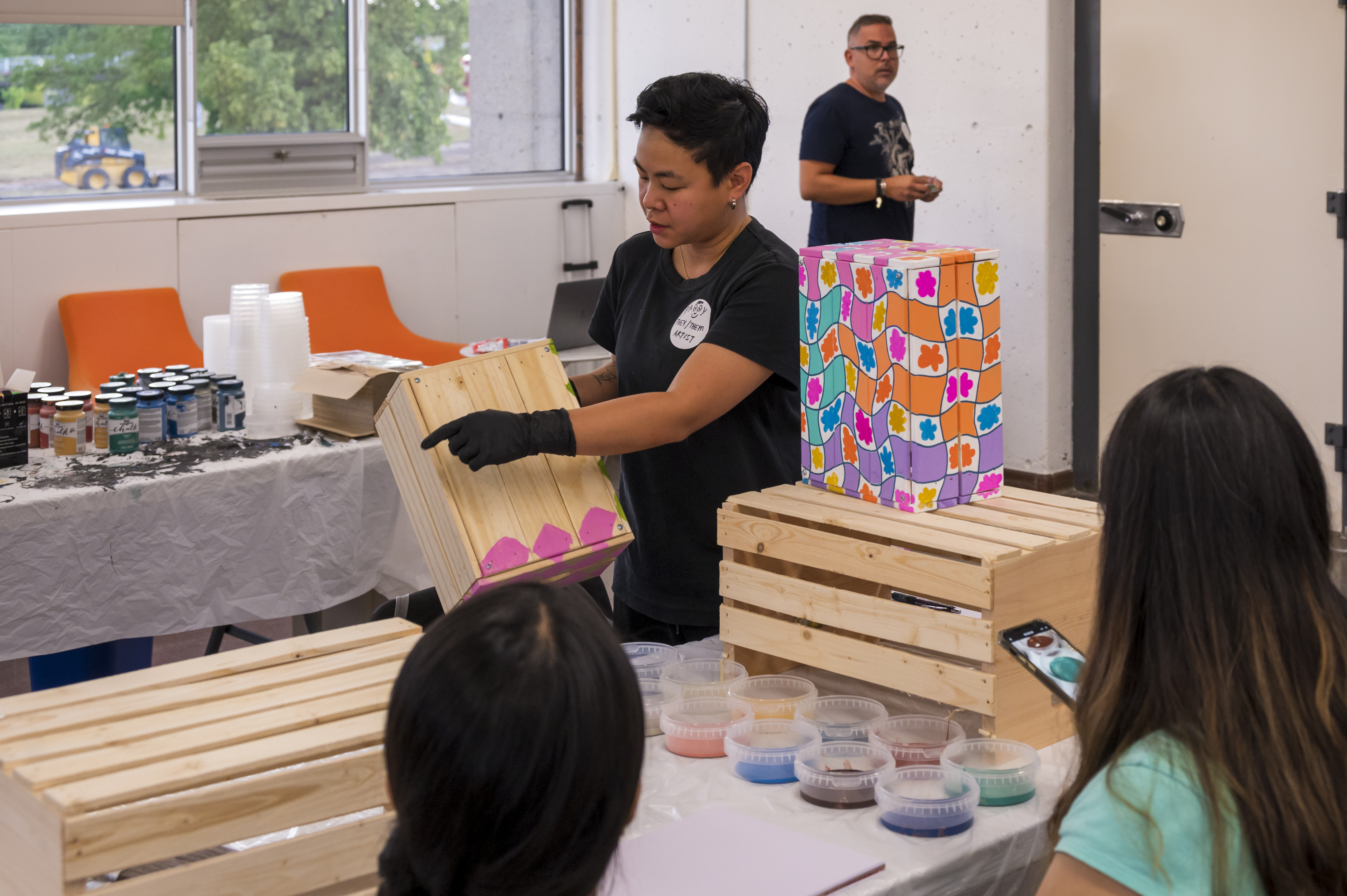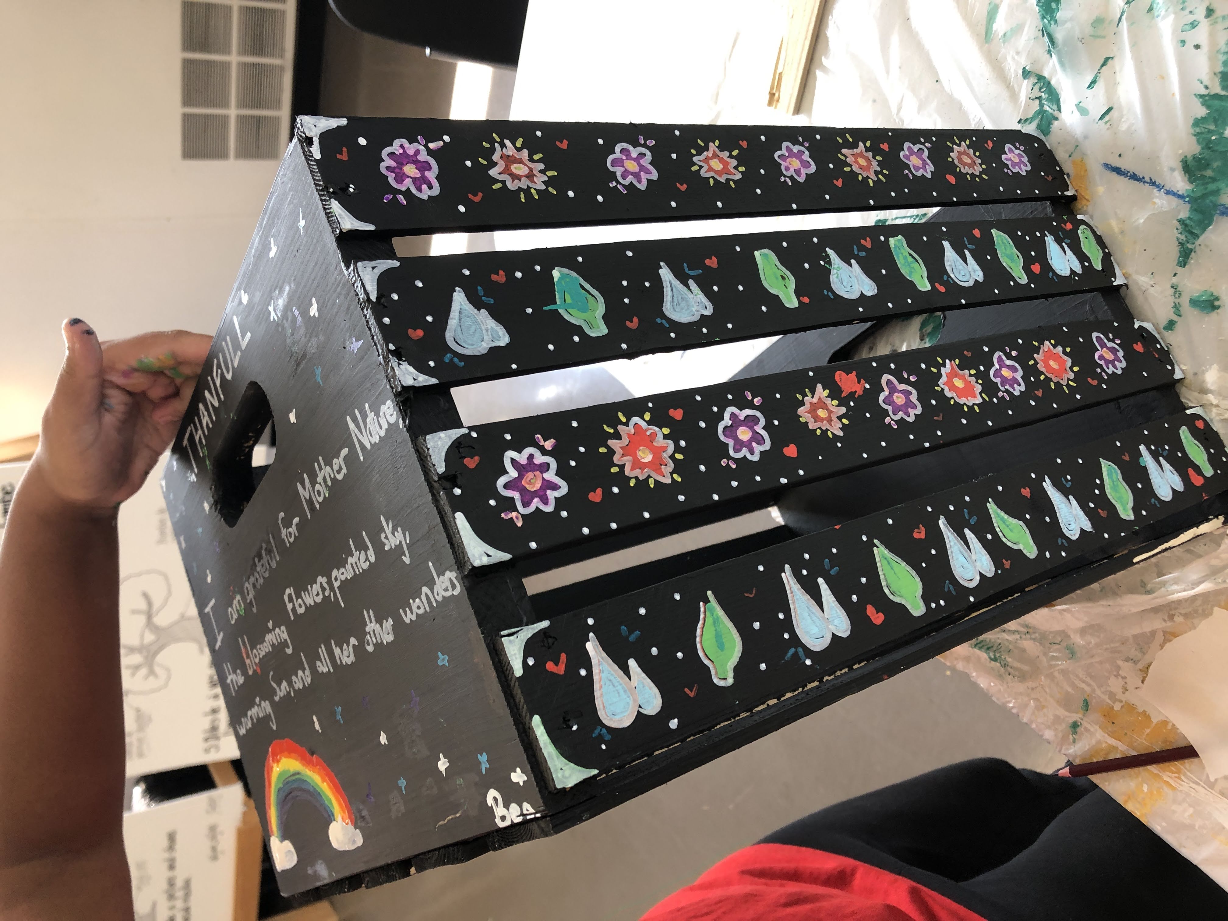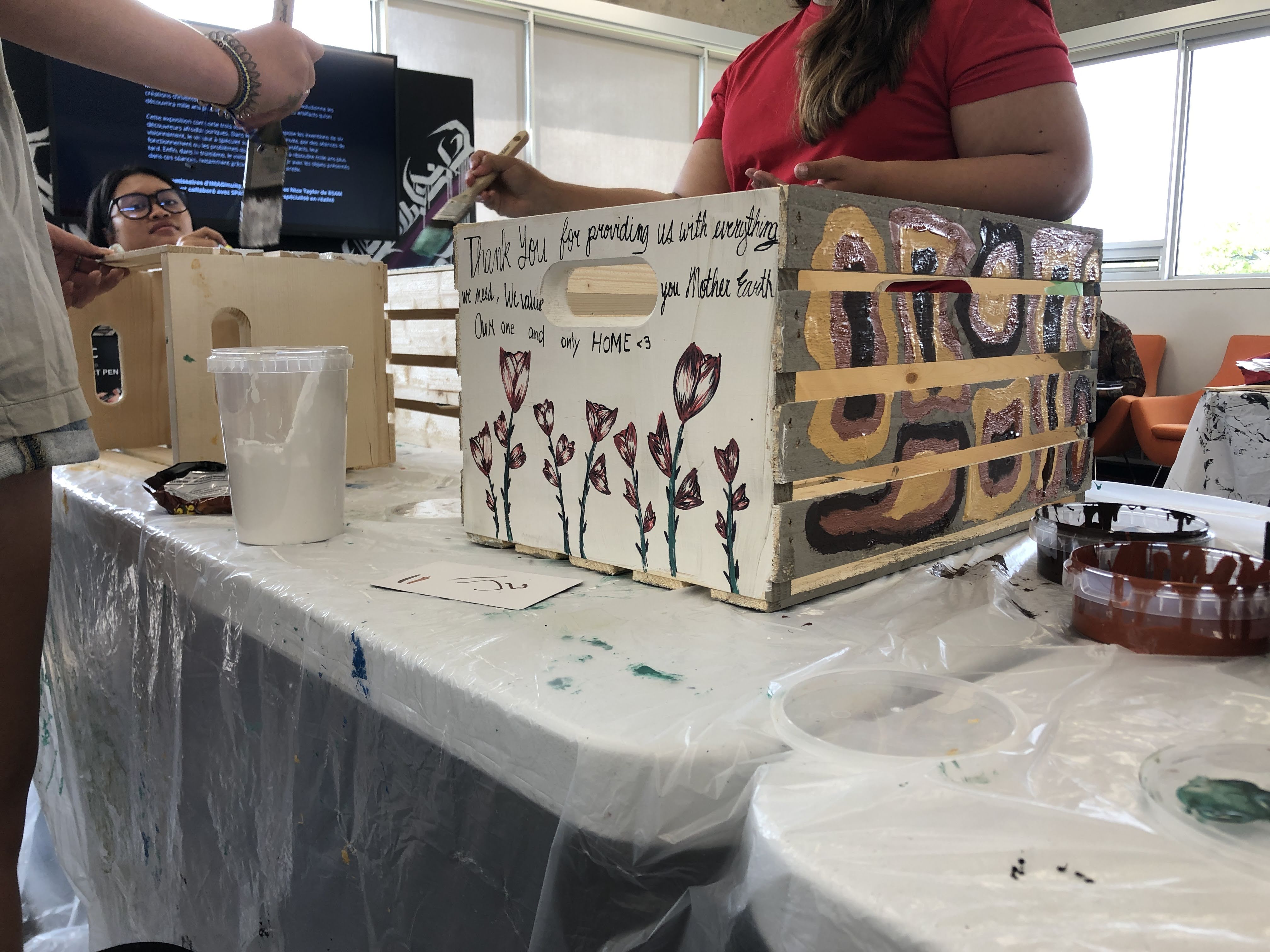 Each participant received an individual crate to take home, while collectively contributing to a larger installation for the Community Interactive Art Exhibition, We CAN do it! When stacked together, these crates formed a multi-sided sculptural mural—like the interconnected roots of a forest, representing how individual actions and acknowledgments come together to create something larger than themselves.