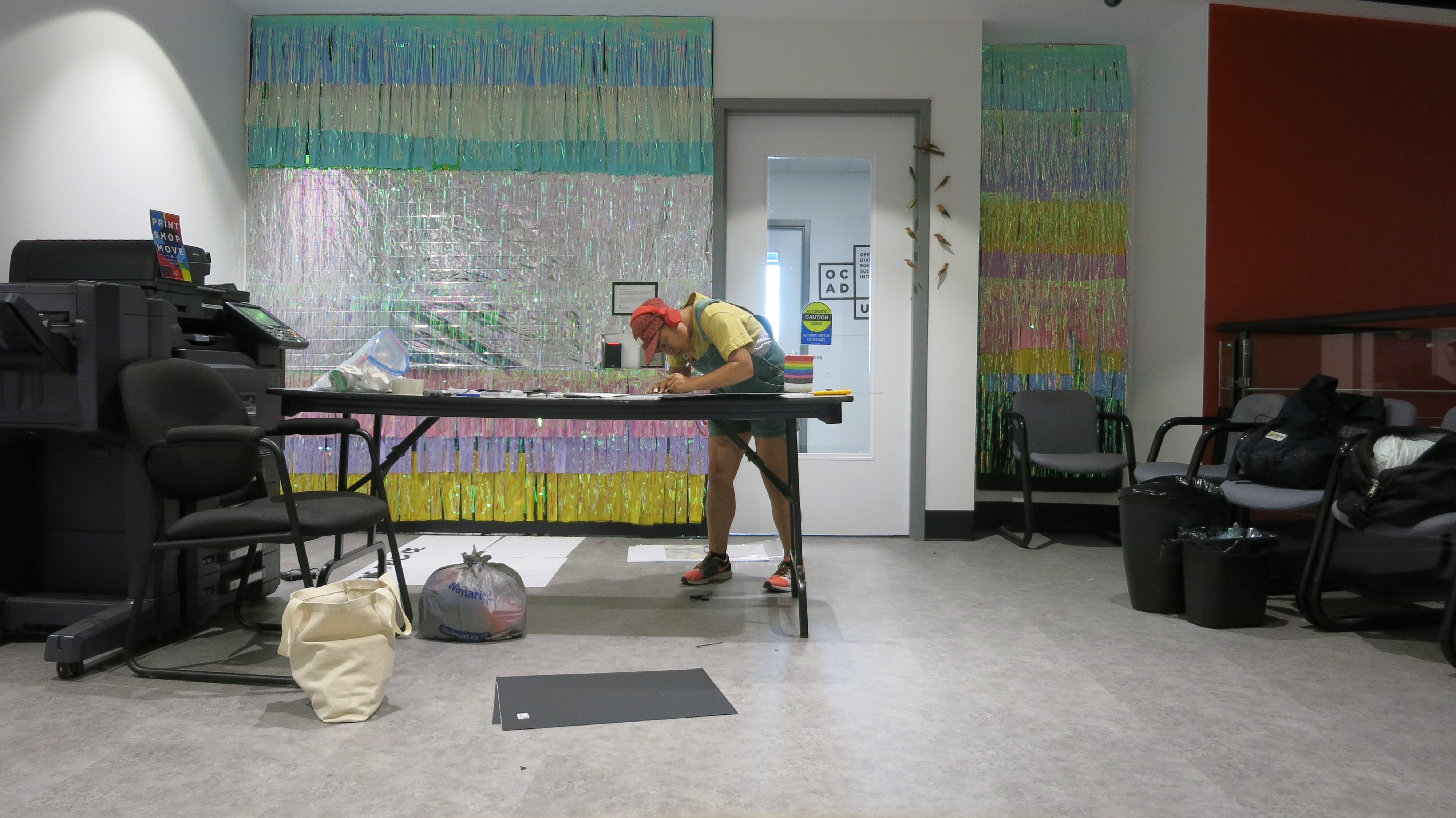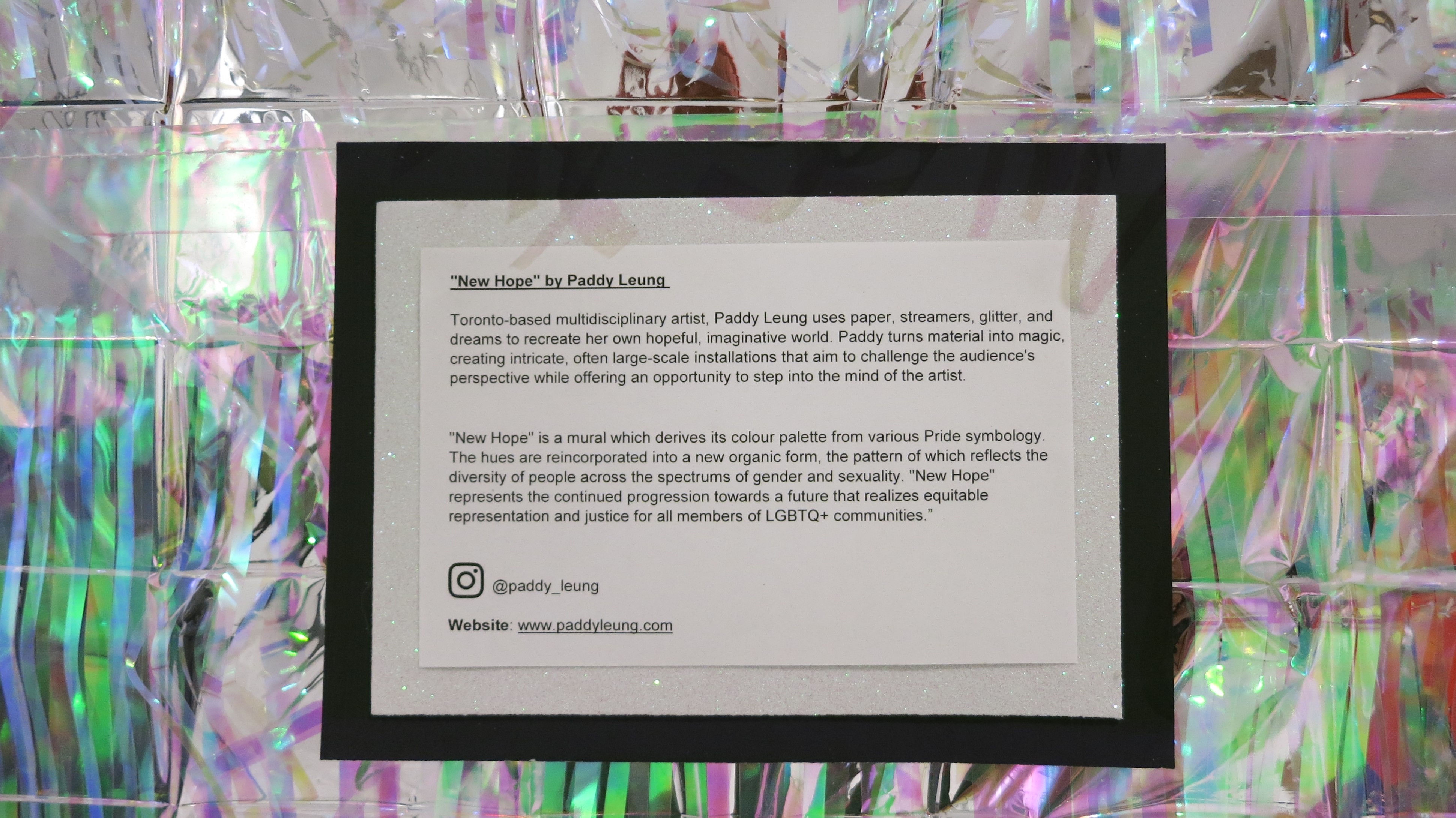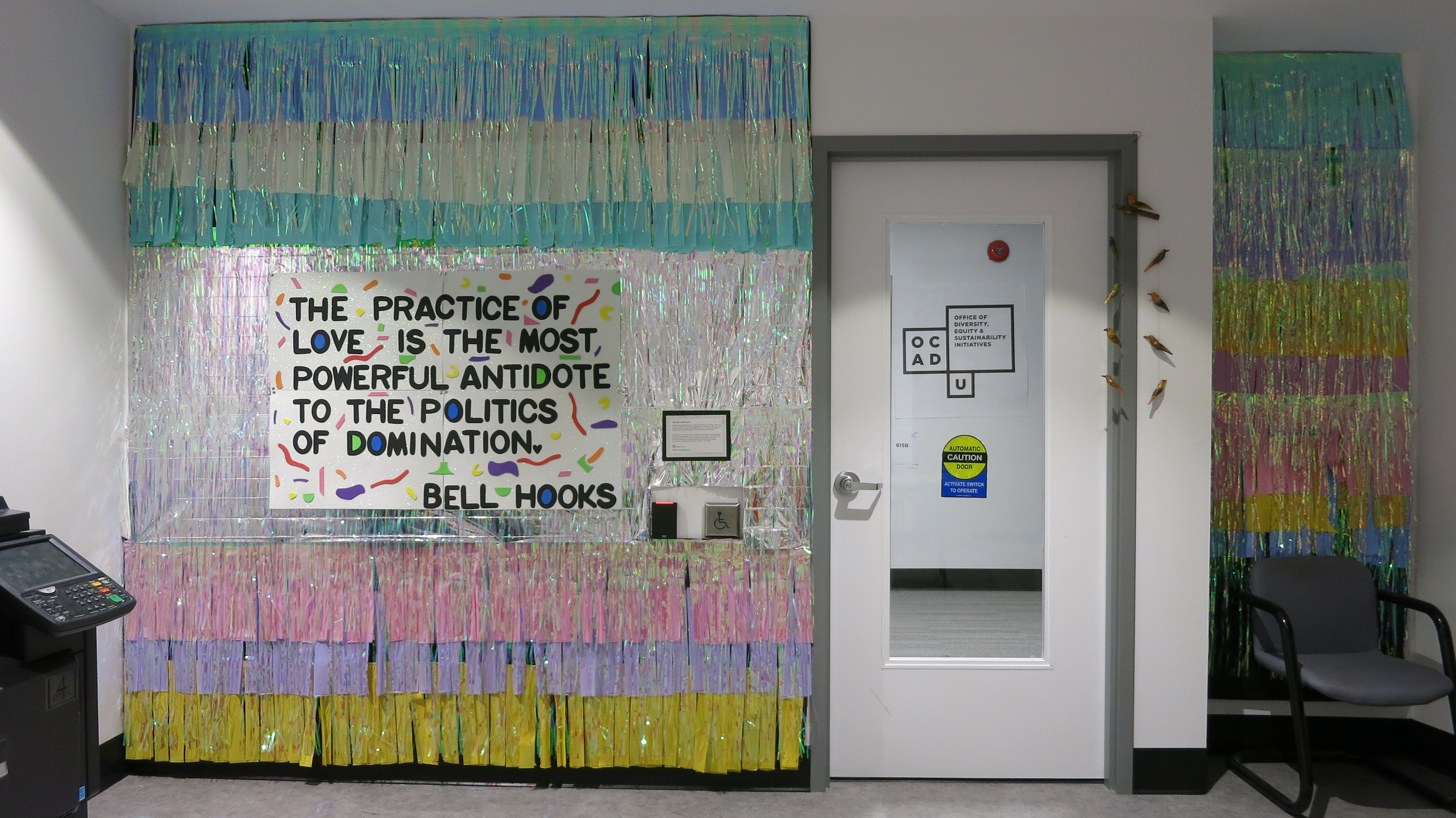 The inspirational quote was chosen by the staff of OCAD University. Inspirit of celebrating Pride, Paddy created a whimsical mixed media mural using party decorations with hand-cut paper and sticky foams to bring some brightness into the office hallway.