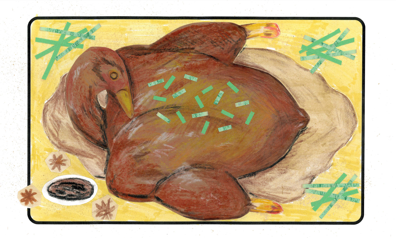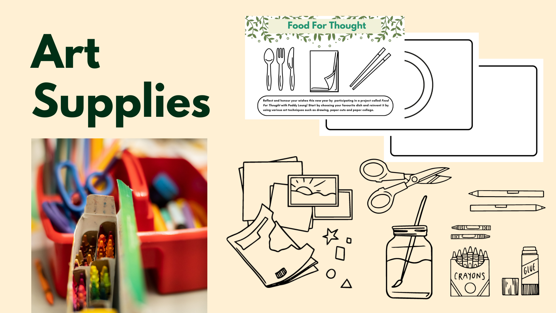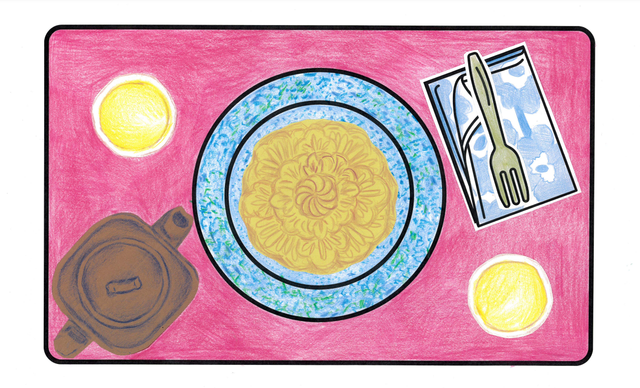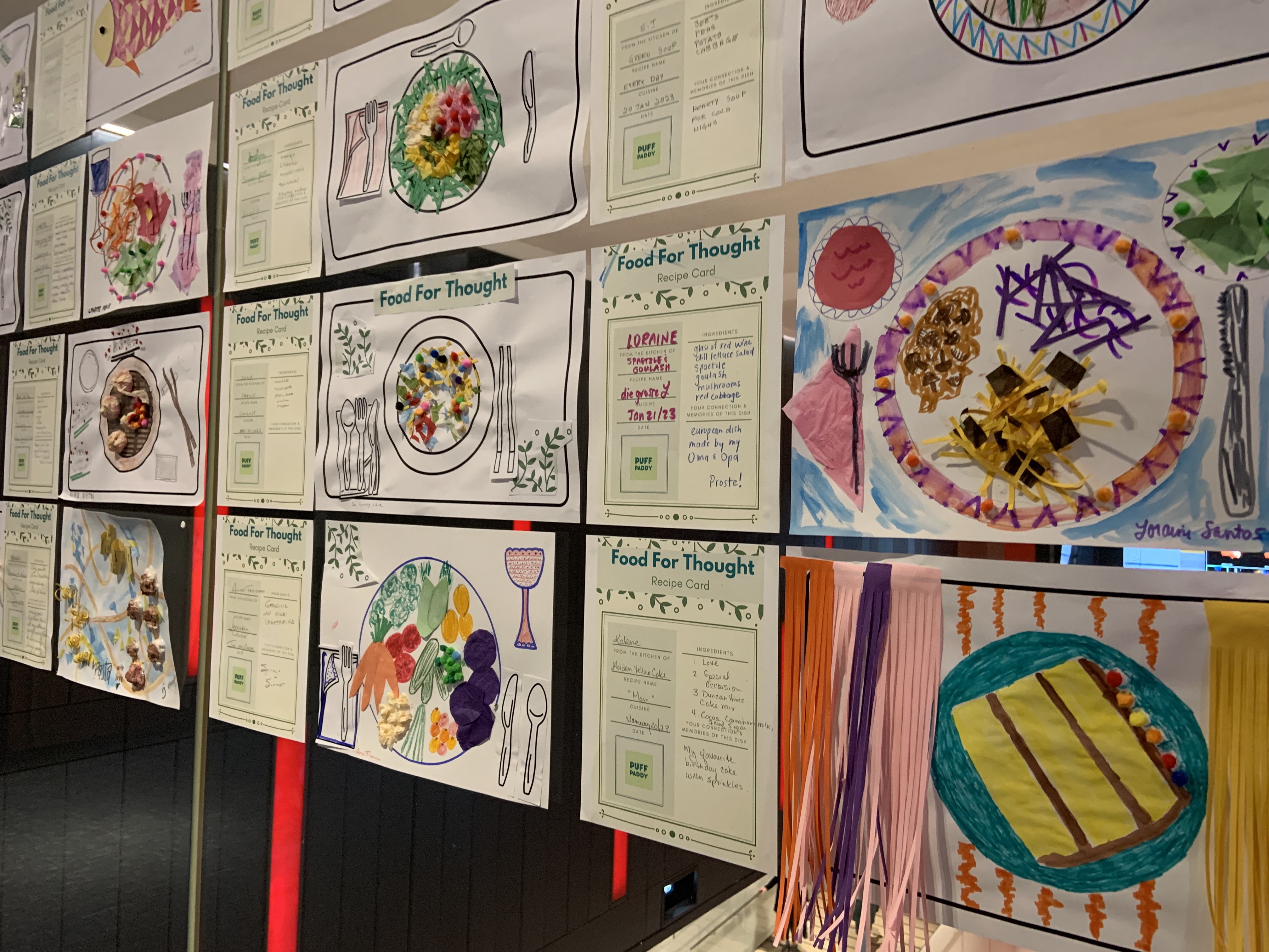 Food For Thought was designed as an accessible art-making experience where participants used provided table mat templates, drawing, and collage materials to create visual representations of their favorite dishes. At the end of the workshop, participants displayed their artwork at the theater entrance, inviting the public to reflect on the intersections of food, memory, and identity