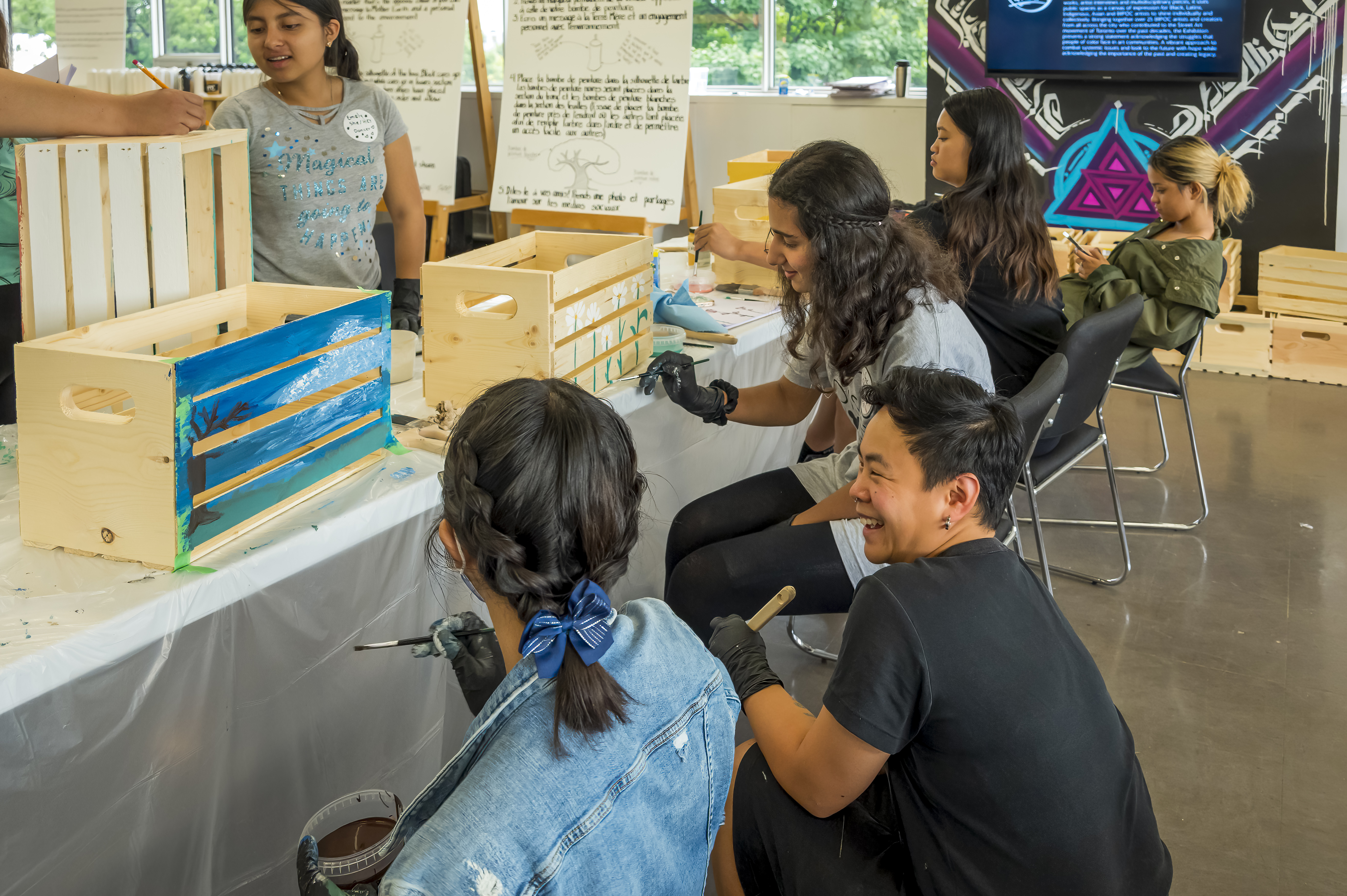 Youth created poems about nature and commitment to the land, then embedded them into wooden crates through mixed media painting. Each participant took home an individual crate while contributing to a collective installation for We CAN do it! Community Interactive Art Exhibition. The program provided meals, TTC tokens, certificates, and volunteer hours.