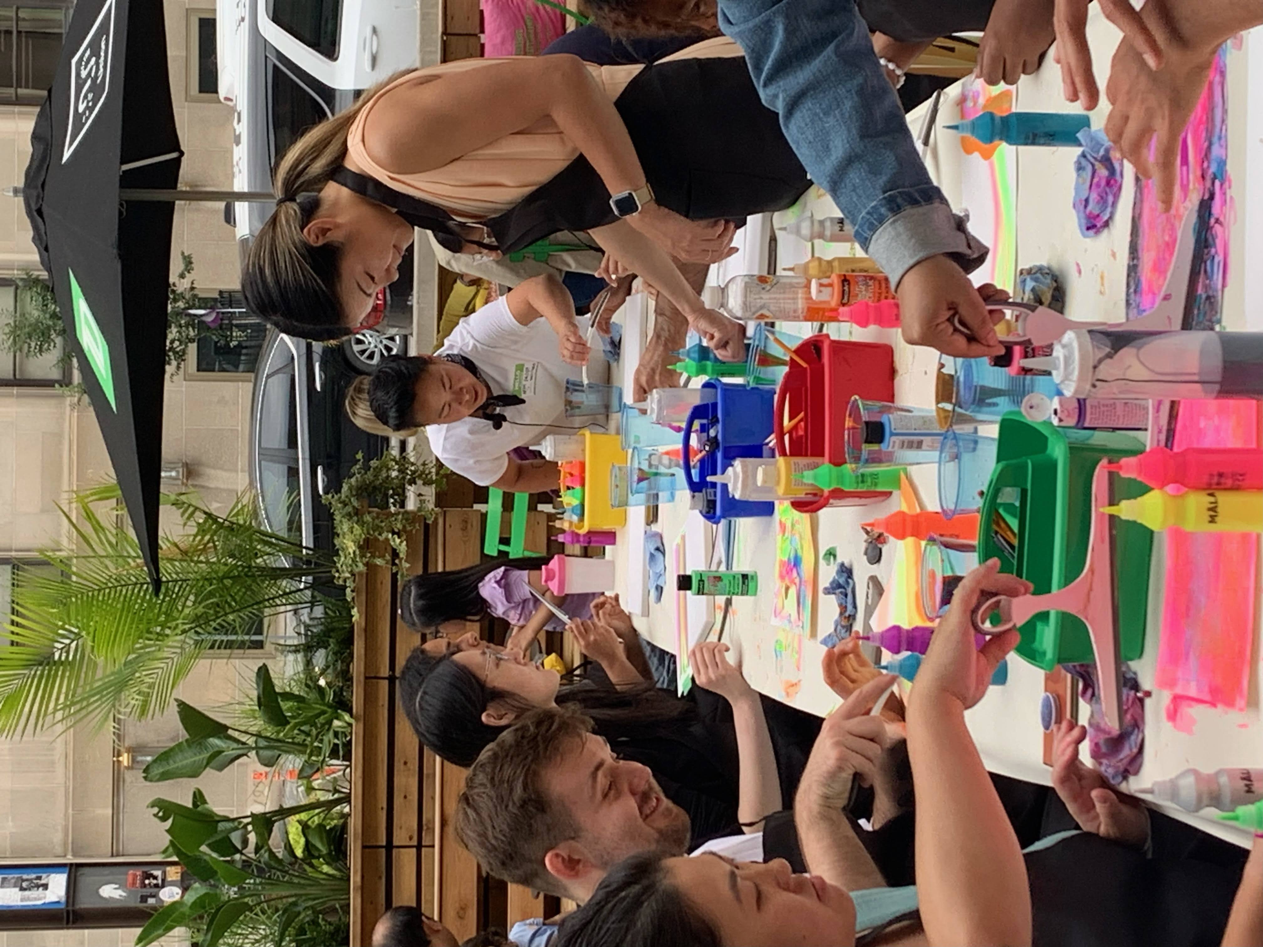 Public engagement was central to the activation. Leung performed live squeegee painting demonstrations on stage, transforming the act of painting into a shared, performative moment. The demonstrations quickly captured attention across the patio, drawing crowds to the tables where participants created their own vibrant works. Throughout the evenings, the space became animated with colour, conversation, and collective energy.