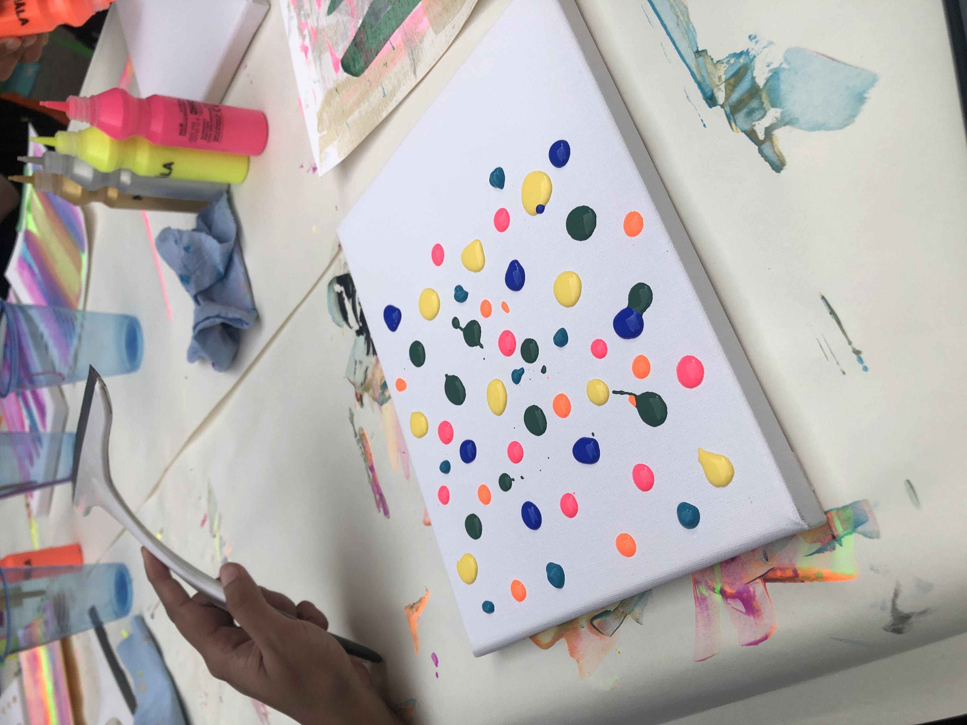 Rather than focusing on refined painting techniques, Leung introduced squeegee painting, an intuitive method using squeegee bottles to explore colour, movement, and chance. This approach removed the pressure of technical skill and invited participants of all ages and experience levels to engage freely with painting. The format proved especially welcoming for families, first-time art makers, and passersby drawn in by curiosity.